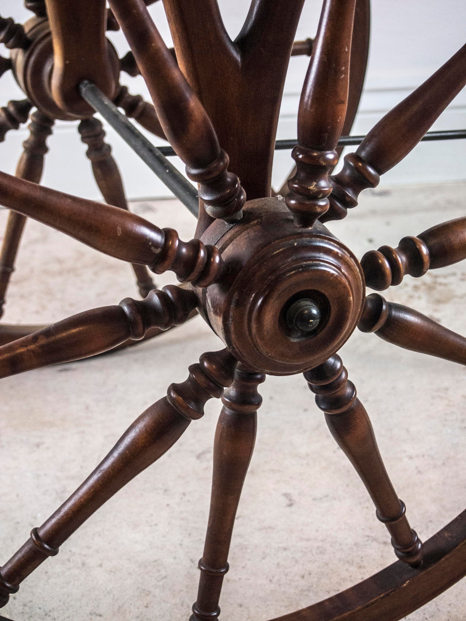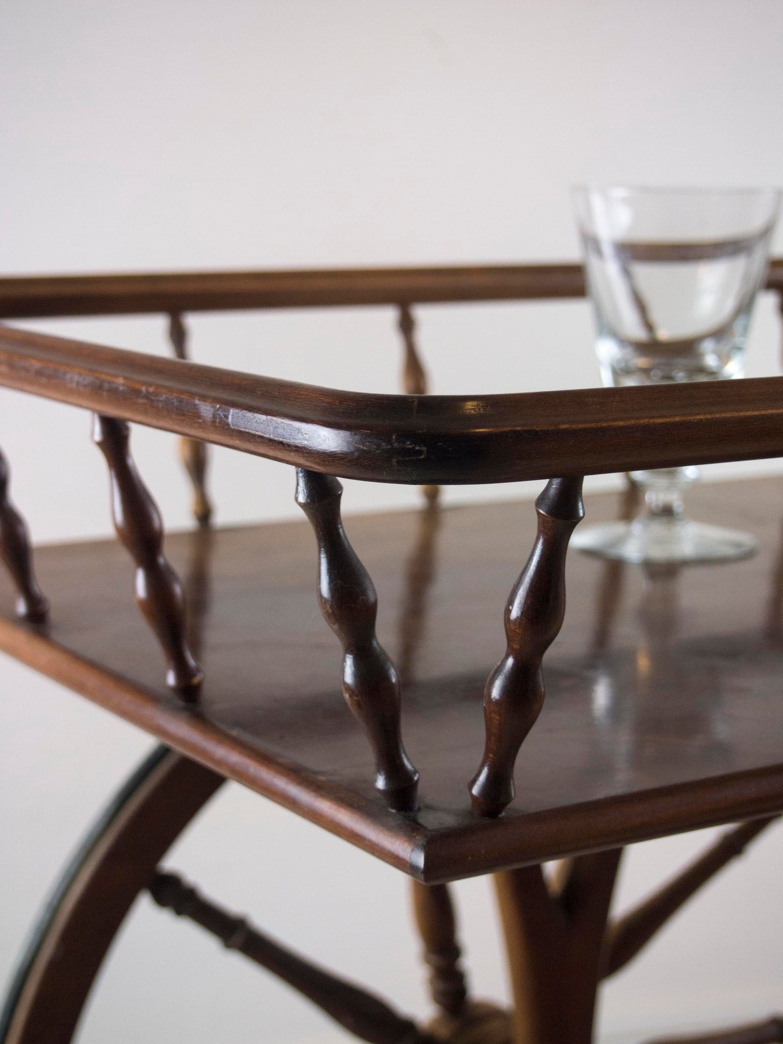 With a pair of over-sized spoke wheels and matched side rails surrounding a large upper serving tray top with three recessed brass bottle holders, all in gently figured mahogany