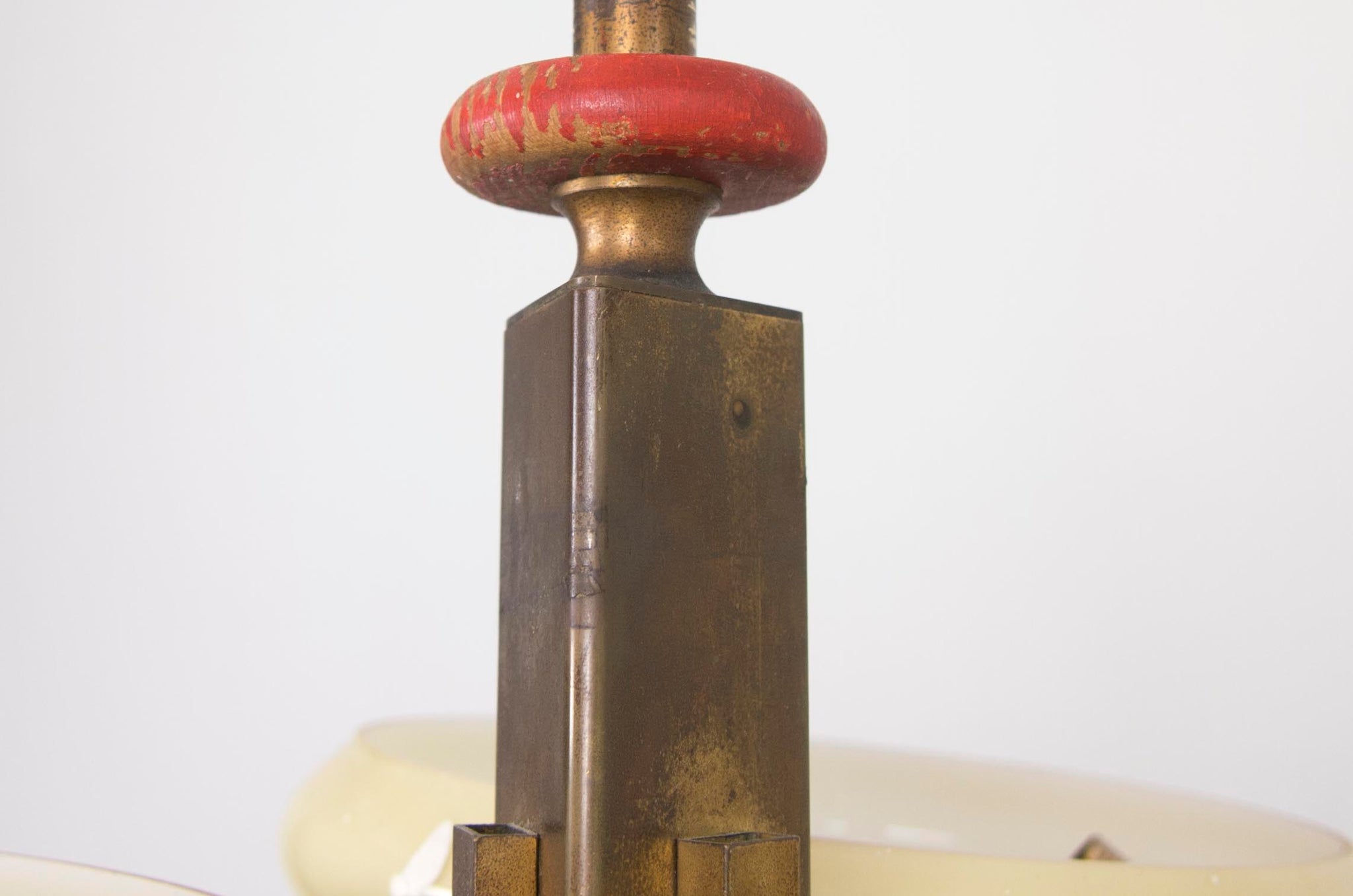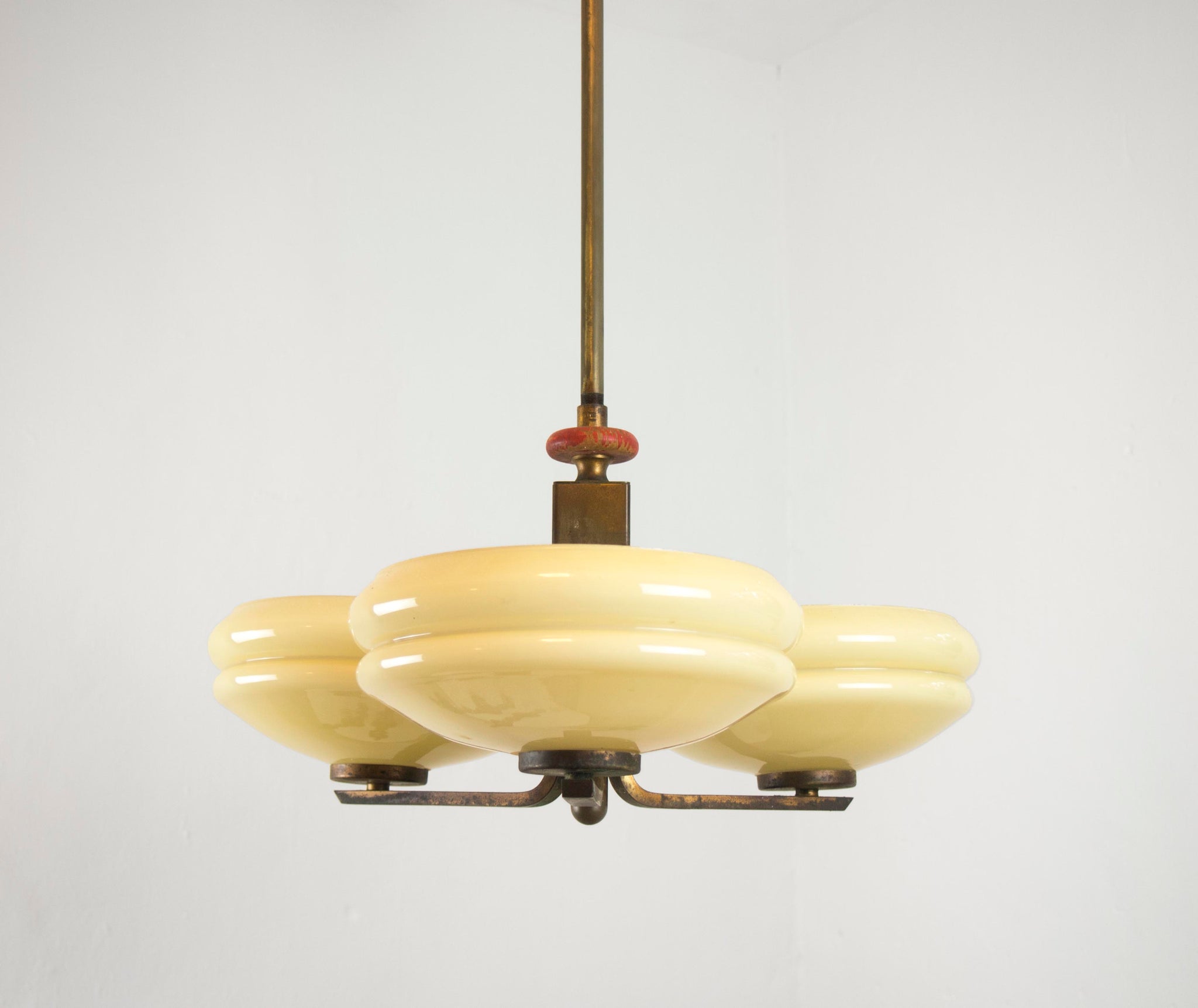 Three cream-coloured glass shades on brass frame and stem, with red painted wooden ring above central body. Of particular rarity, this model was generally produced with a cheaper chrome frame and white glass shades. Possibly a prototype