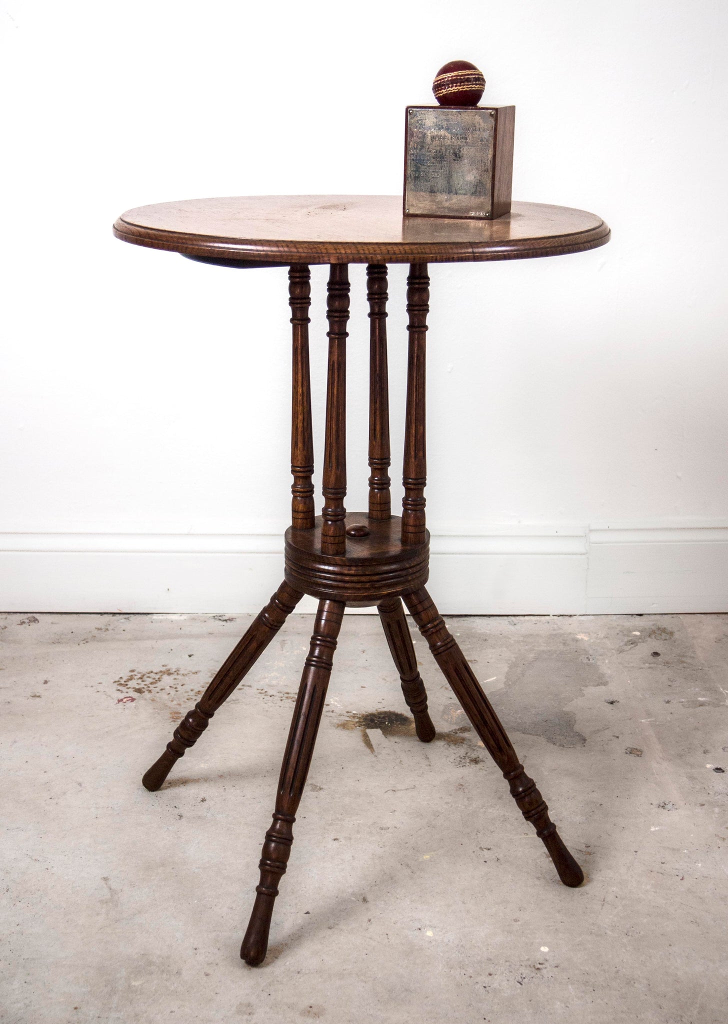 Circular occasional or gypsy table of unusual open spindle form, polished and stained oak with four splayed legs of turned baluster shape. Of particularly fine quality and finish. Probably made for Liberty of London