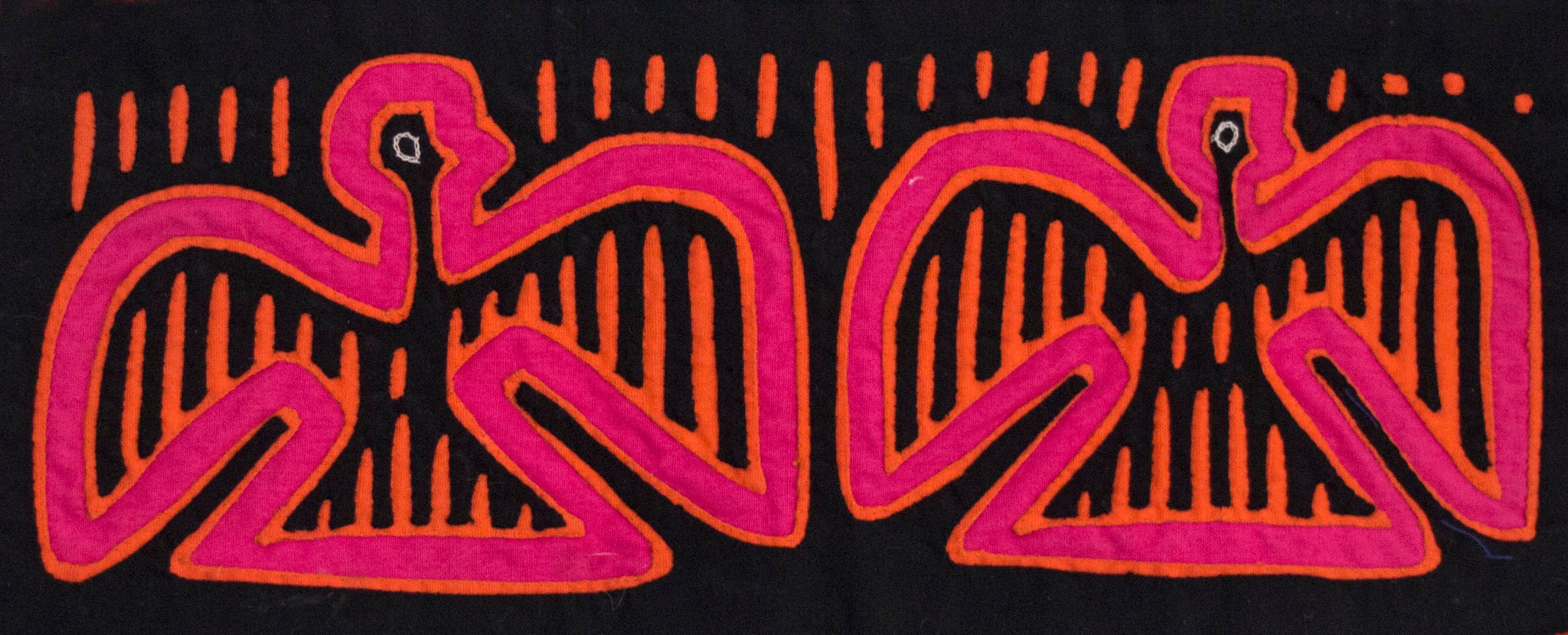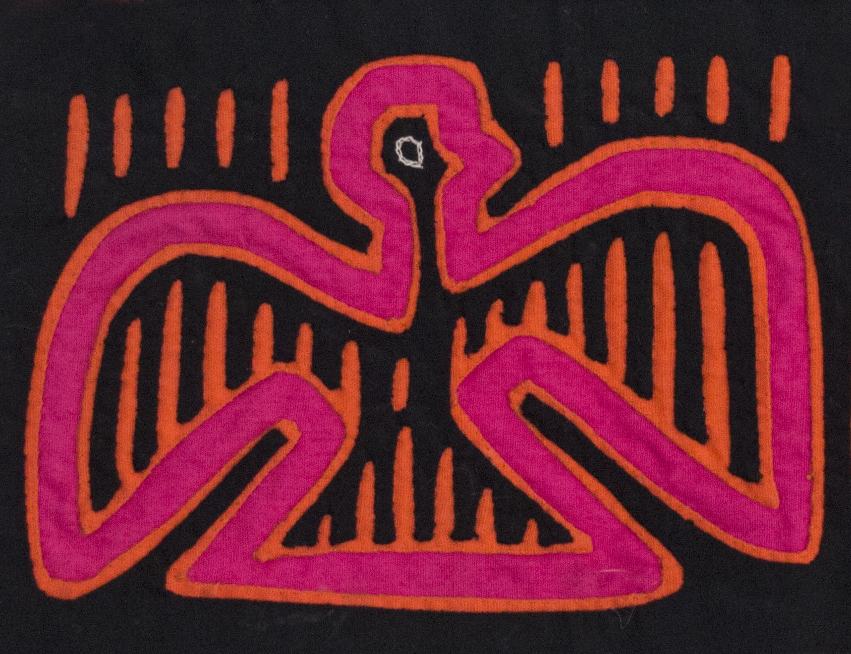 The Mola, or Molas, is a hand-made textile that forms part of the traditional women's clothing of the Kuna People of Panama. Mola textiles originate from a long tradition of body painting and it was only after colonisation by the Spanish that the Kuna began to transfer their traditional geometric designs onto fabric. It is not known for certain when this technique was first used, but it is assumed that the oldest molas are from the 19th Century. Designs have tended to depict abstractions of flowers, sea animals, birds or popular culture.