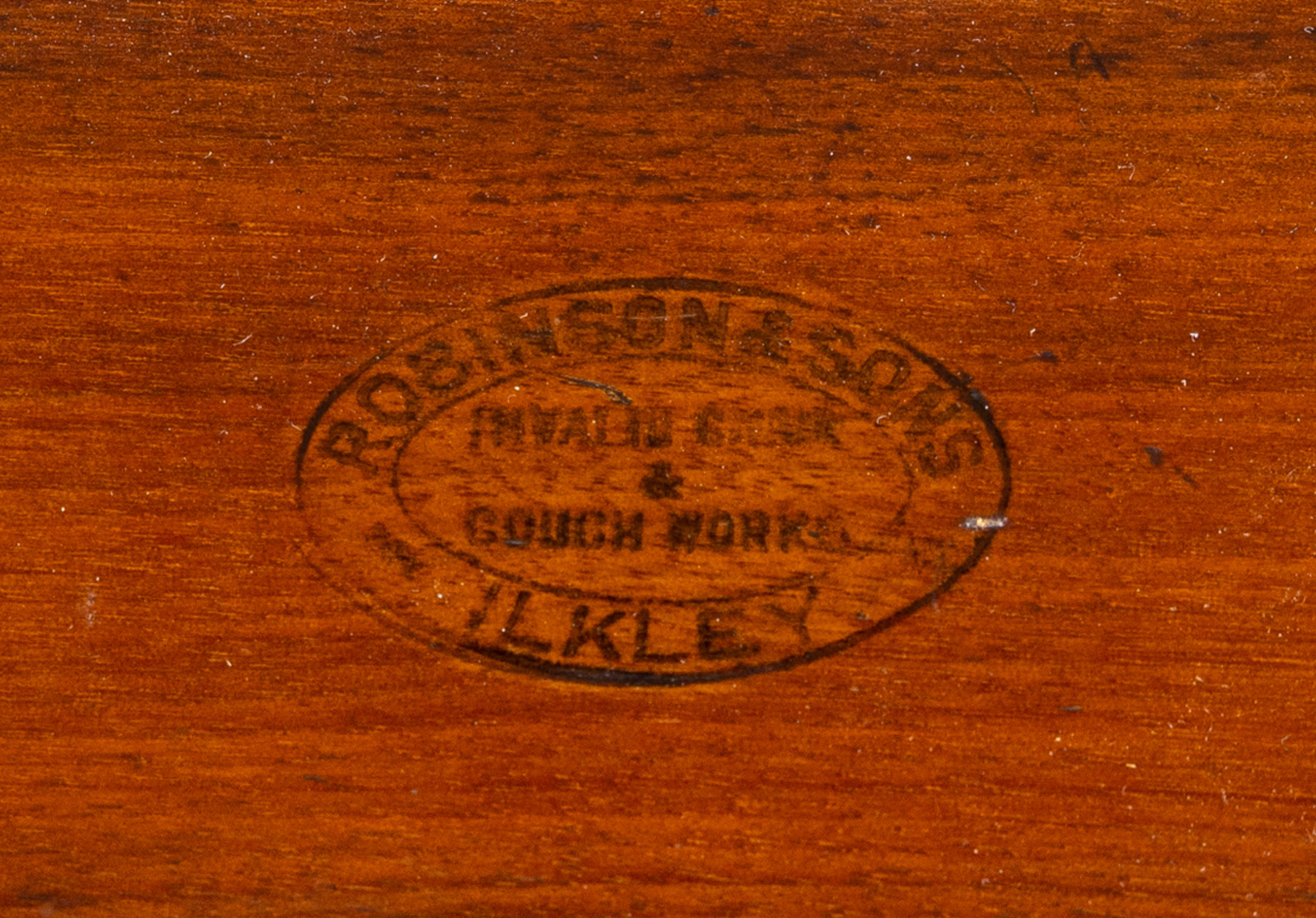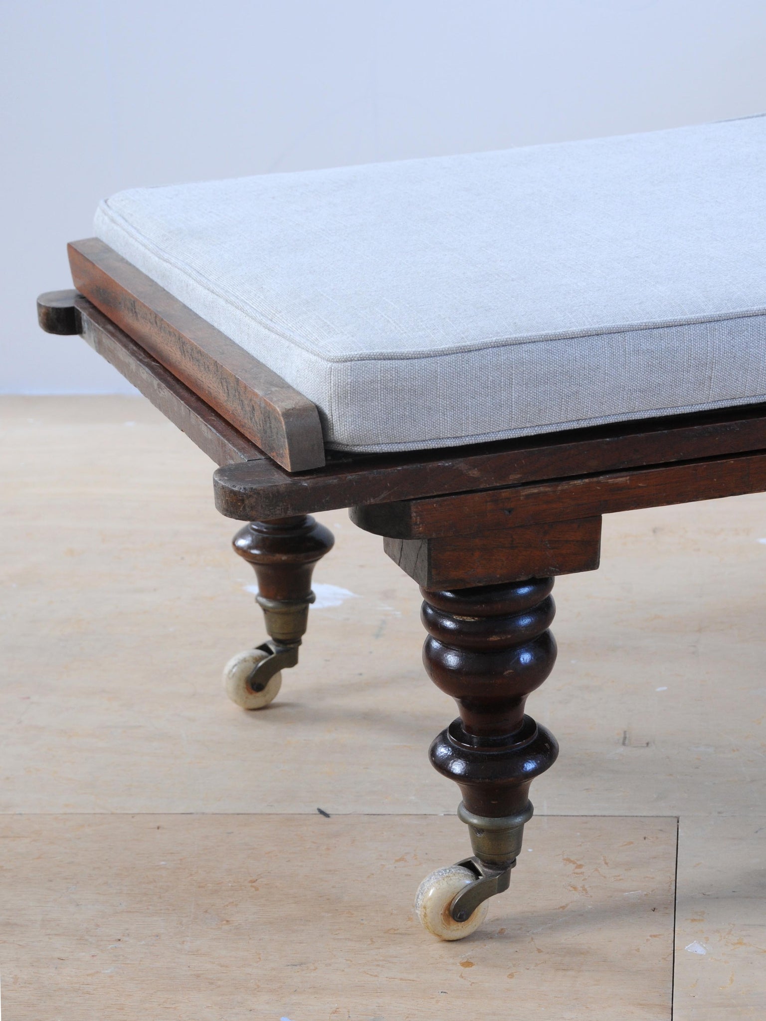 Mahogany portable campaign day bed with three caned sections that adjust their angle on a ratchet allowing a flat bed or to raise the back and legs to a variety of comfortable positions, supported on turned legs ending with porcelain and brass casters. There is a removable bar at the foot to stop cushions from sliding off. The back is stamped with logo of  “Robinson & Sons of Ilkley” (Yorkshire). There is also a very faded label that is illegible. Robinson took out a patent for this couch March 9, 1878.