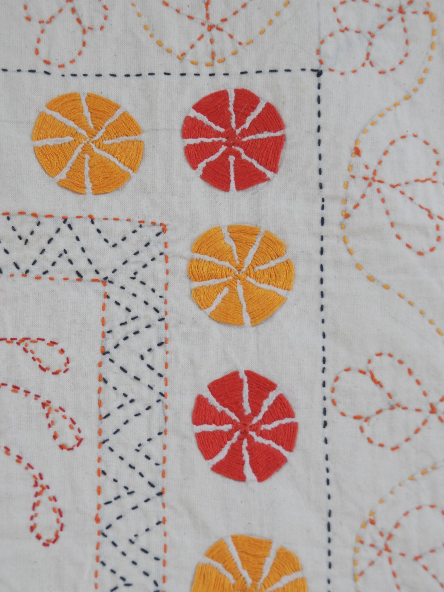 Kantha is one of the oldest forms of embroidery that originated in India. Its origins can be traced back to the ancient pre Vedic ages, however, Kantha embroidery as we know it today was found in Krishnadas Kaviraj’s 500 year old book, Chaitanya Charitamrita. Motifs found in early Kantha embroidery include many symbols that were derived from ancient art. These symbols depict or are reflective of nature, such as the sun, the tree of life and the the universe. It was not until later that Kantha embroidery was used as a medium of cultural and religious significance, which came about as a result of Hinduism's influence and was used in ceremonies and pujas, including to celebrate weddings and births