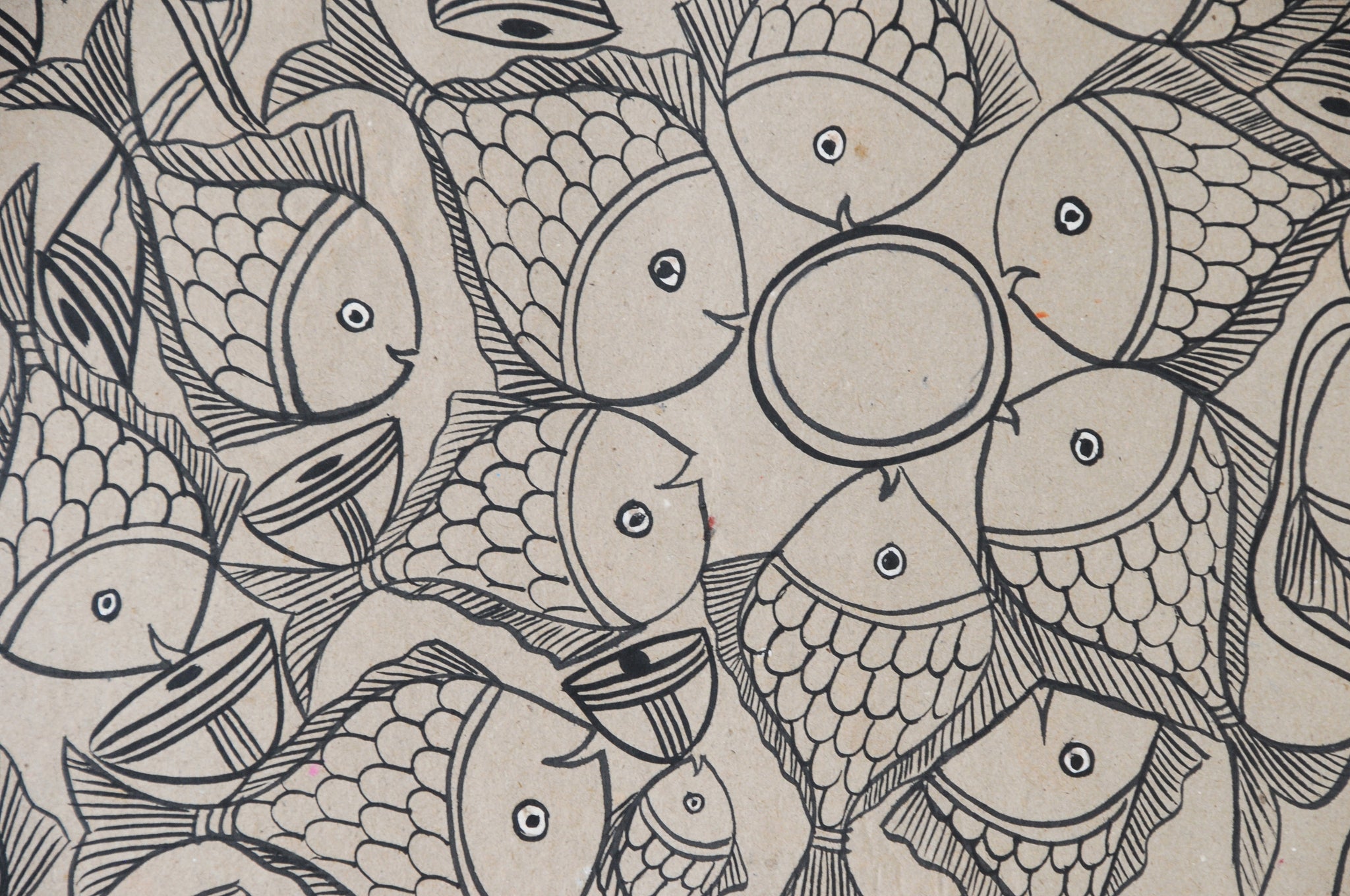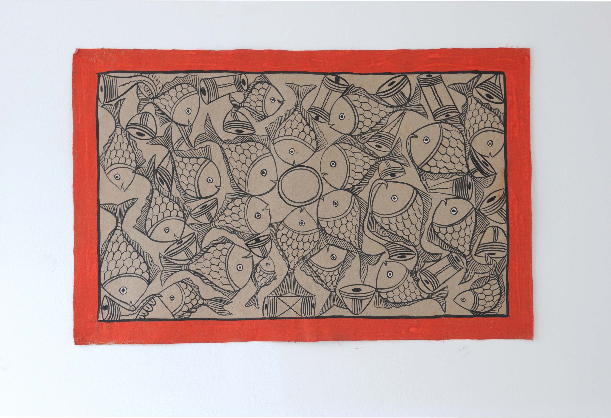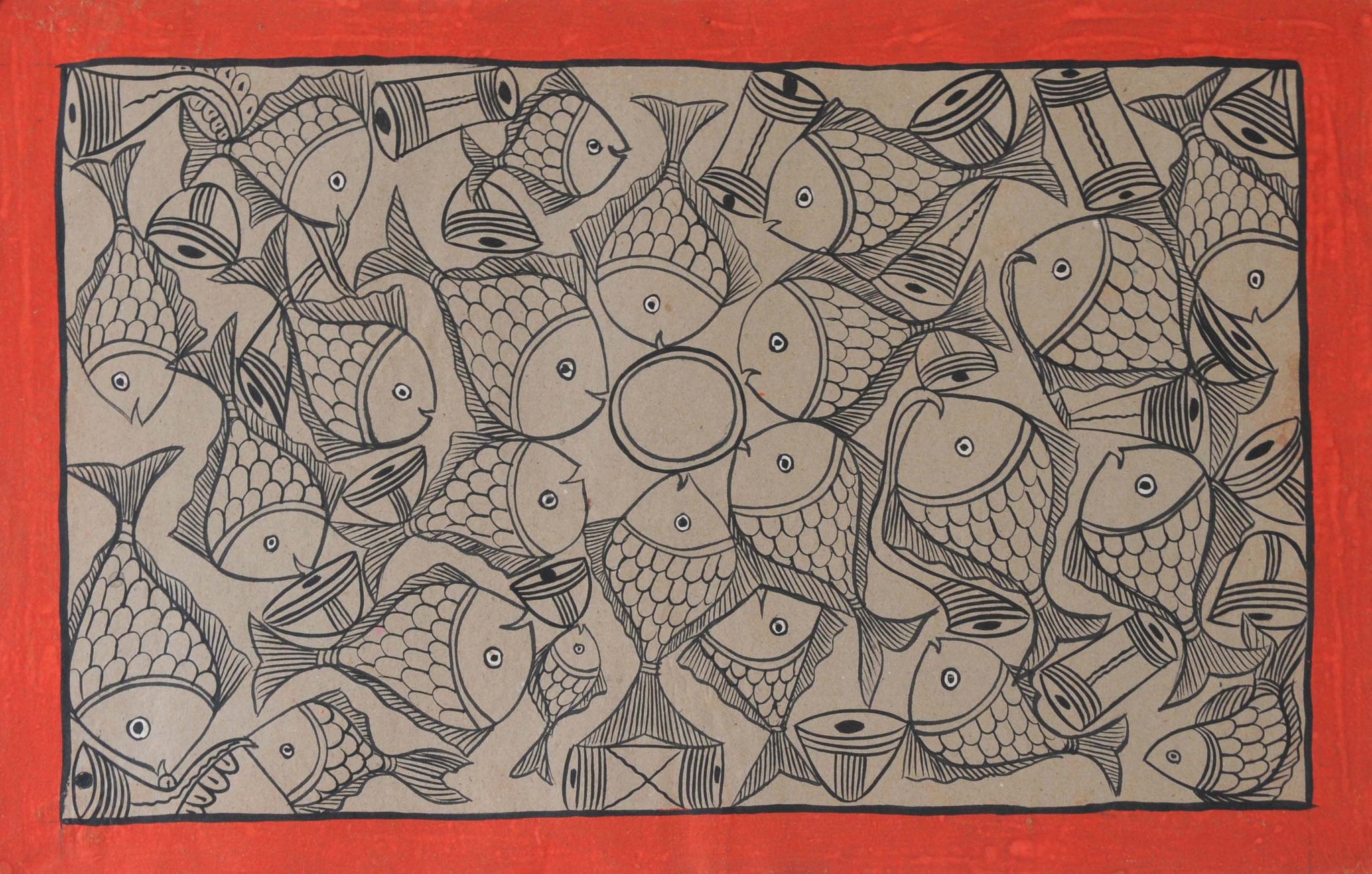 Stylised fish with tabla and dhol drums, inside a red border. The Rhythmic shoal appears to centre around a feeding frenzy which happens to be a fish wedding. The fishy guests are celebrating the marriage of their fellow fish, enacted through various activities such as eating and dancing. Serious fun, as well as a beautifully coloured graphic image.